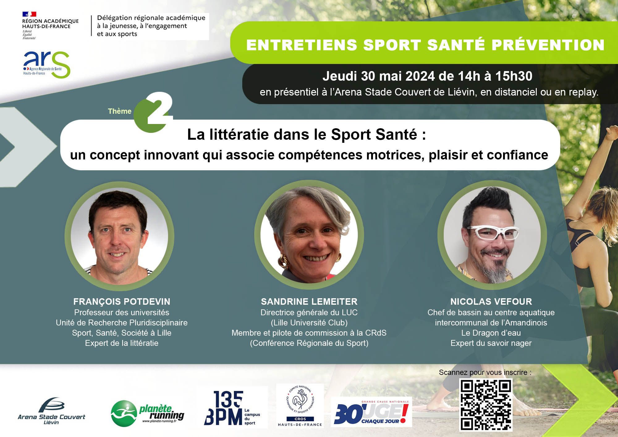 Nous vous donnons RDV pour le 2ème Entretien Sport Santé Prévention ; une initiative des services de l’Etat en Région Hauts-de-France : la DRAJES et l’Agence régionale de santé Hauts-de-France. Une dynamique qui est réalisée en partenariat avec l’Arena Stade Couvert, le CROS Hauts-de-France, 135 BPM : Le 1er Campus du Sport et portée techniquement par l’Association Planète Running and Walking