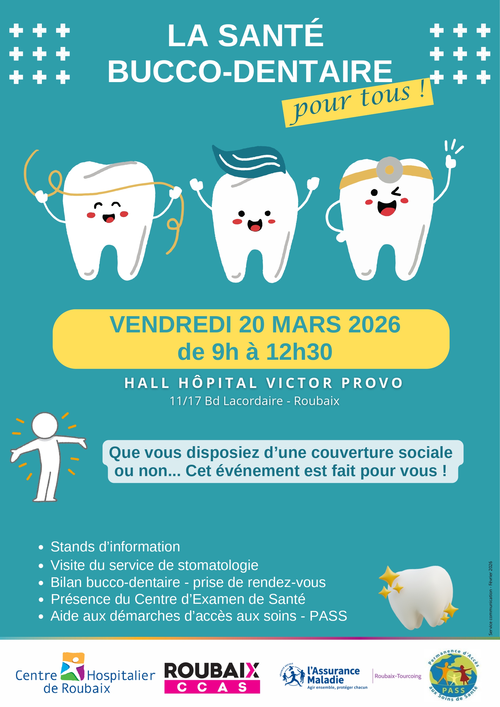 Le vendredi 20 mars de 9h30 à 12h30, les professionnels de la Permanence d’Accès aux Soins de Santé (PASS), du service de stomatologie, du Centre d’Examens de Santé et nos partenaires – le CCAS de Roubaix et la CPAM de Roubaix-Tourcoing – se mobilisent pour organiser une action de santé bucco-dentaire destinée à tous.