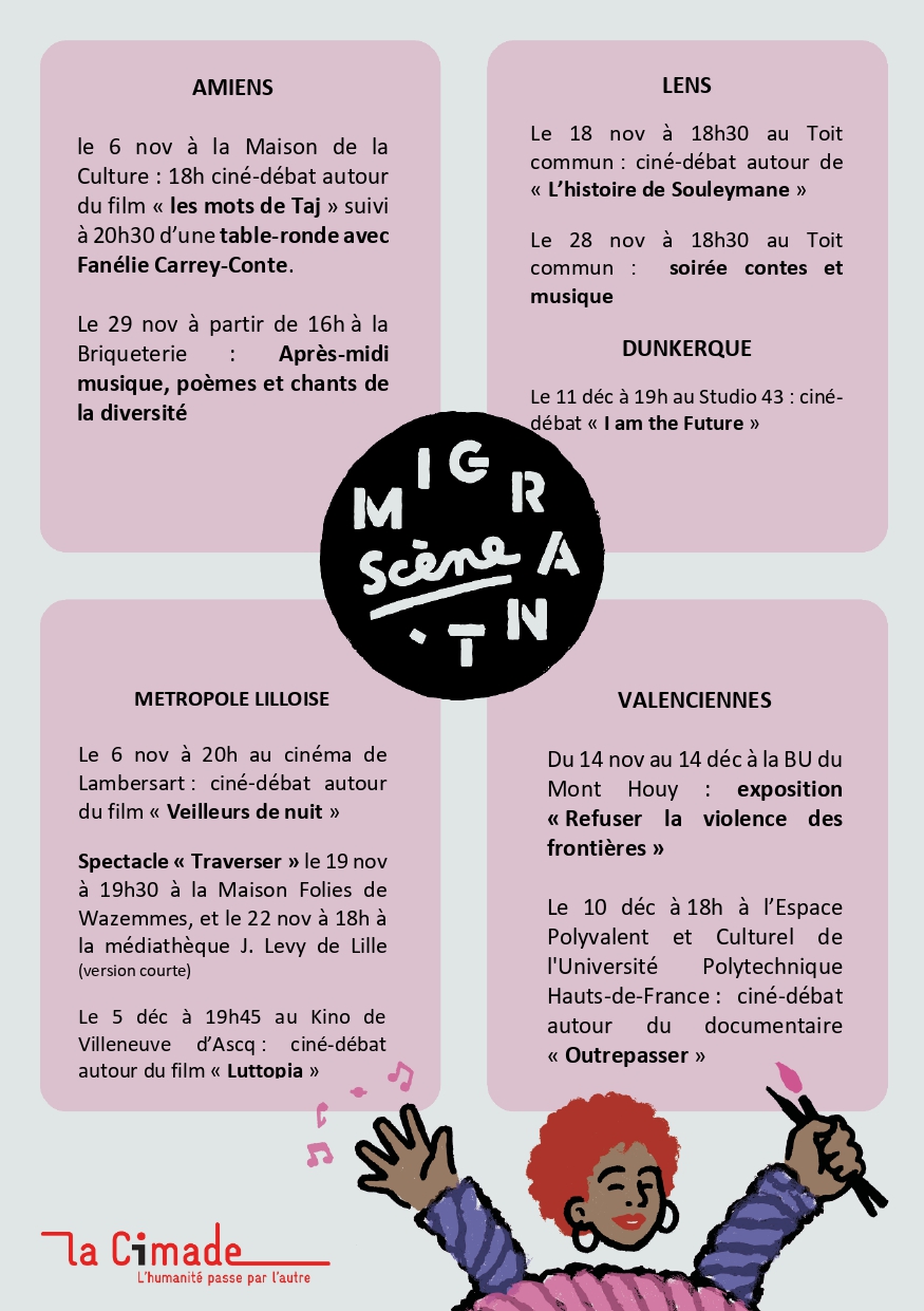 Le 6 novembre à la Maison de la Culture d’Amiens : à 18h ciné-débat autour du film « les mots de Taj » suivi à 20h30 d’une table-ronde avec notamment Fanélie Carrey-Conte, Secrétaire générale de la Cimade. En partenariat avec l’Université populaire d’Amiens