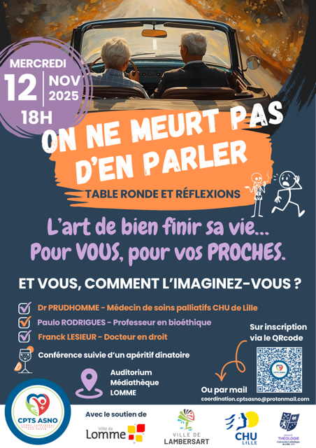L’équipe du groupe de travail « Bien vivre et bien vieillir » de la CPTS ASNO (Communauté Professionnelle Territoriale de Santé Alliance Santé Nord Ouest) avec le soutien de la Ville de Lomme, la Ville de Lambersart, l’Université Catholique de Lille et le CHU de Lille vous prie de bien vouloir trouver ci-dessous une invitation à une table ronde « On ne meurt pas d’en parler ».